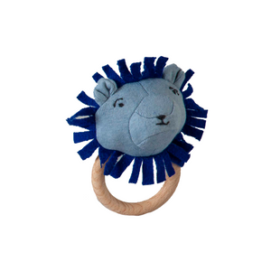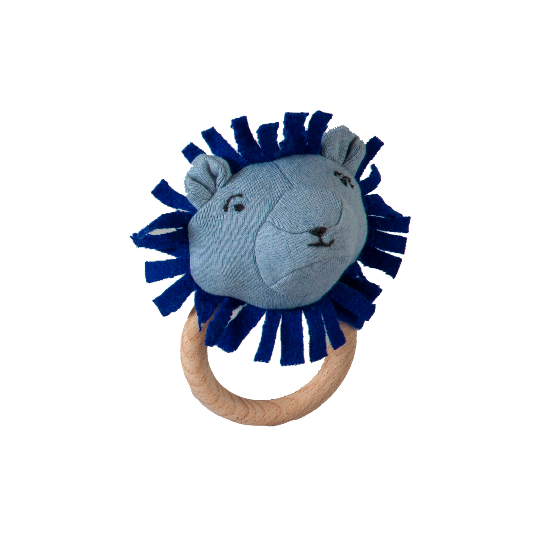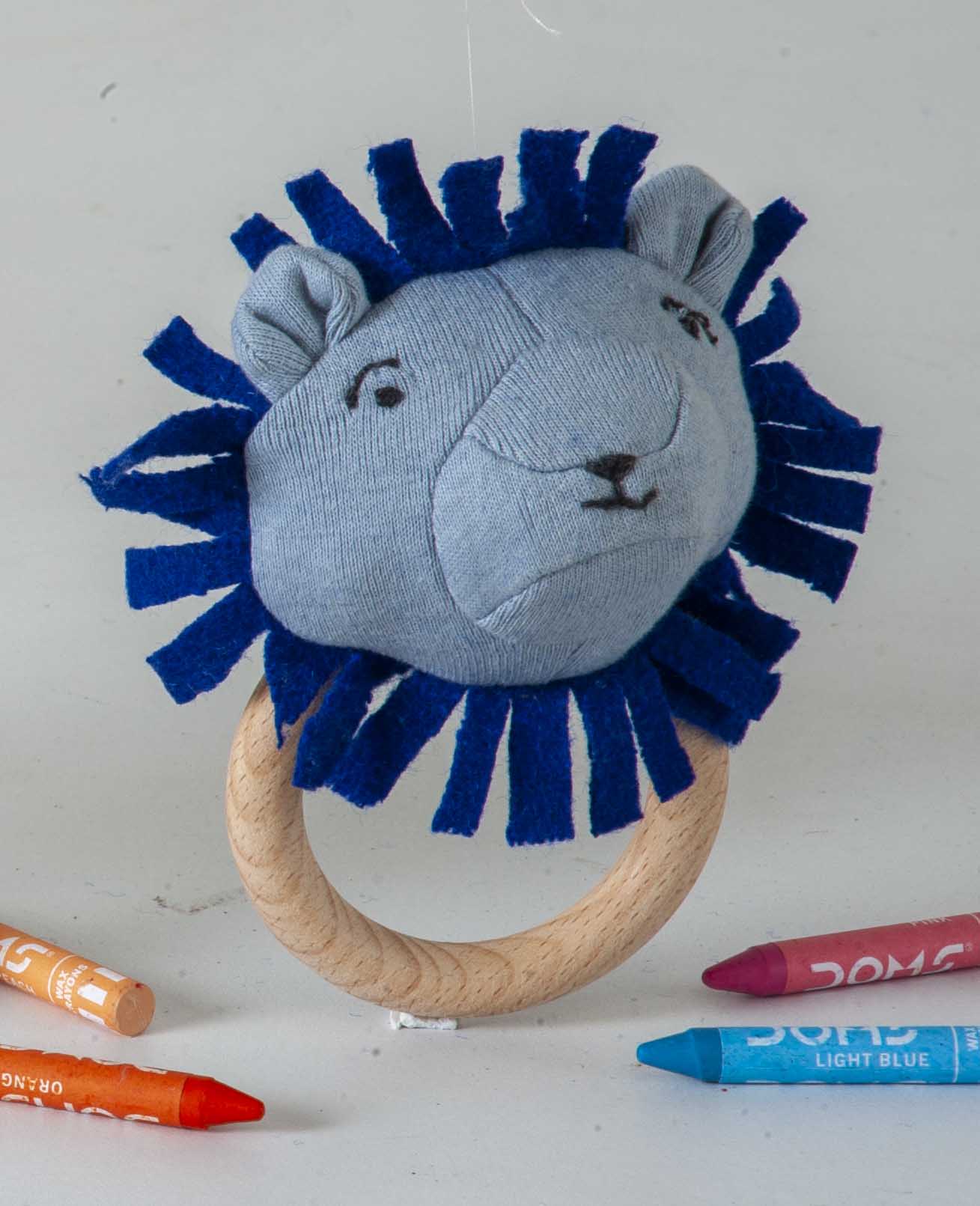 • Light and dark blue lion rattle, hand-knitted from 100% premium cotton.
