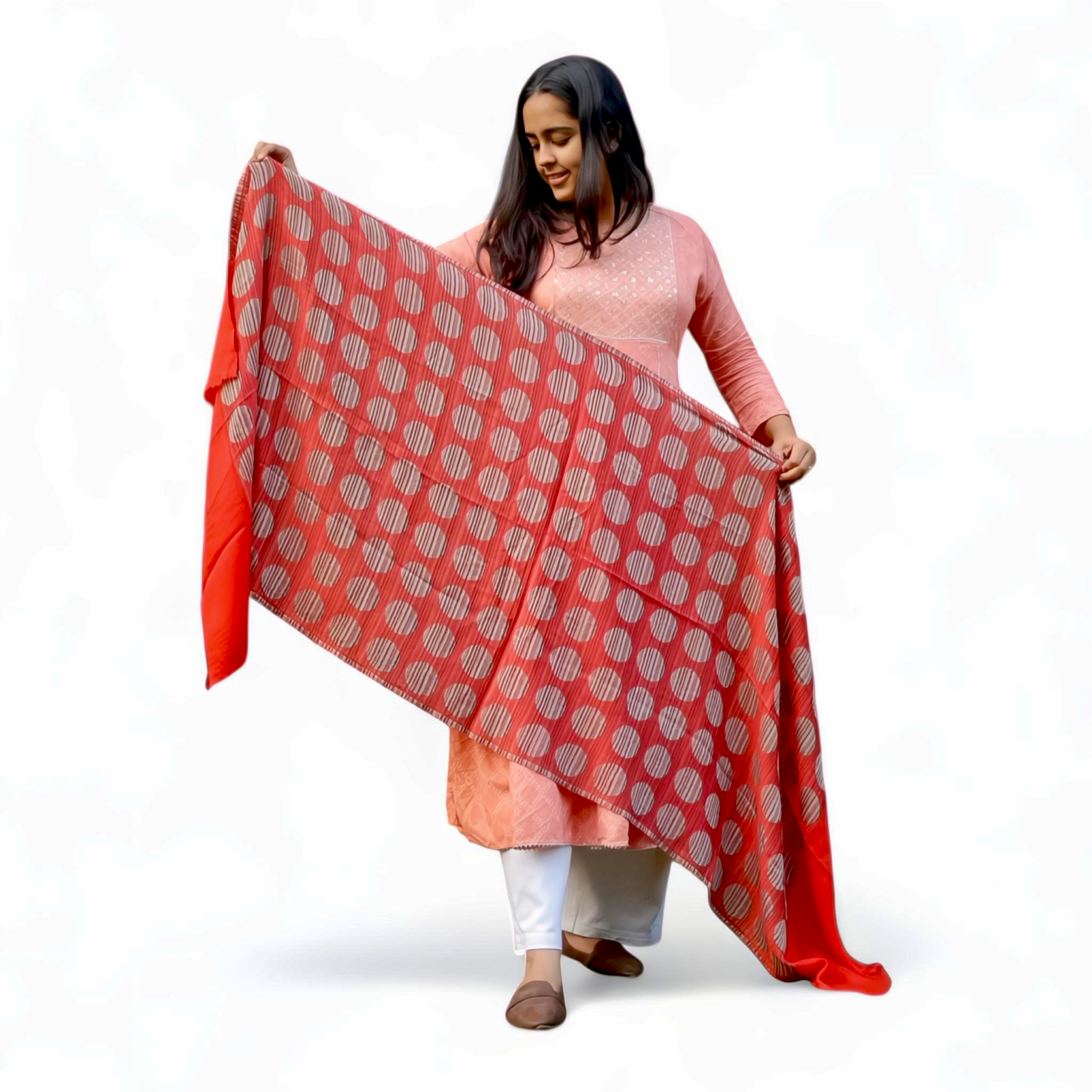 Elevate your winter wardrobe with this Red Multicolour Polka Design Stole, crafted from a premium wool–silk blended fabric that combines warmth, softness, and a luxurious drape. The vibrant red base paired with multicolour polka detailing creates a bold, playful yet elegant look—perfect for adding personality to both casual and festive outfits. Lightweight yet warm, this stole offers effortless styling for all seasons.