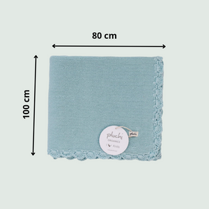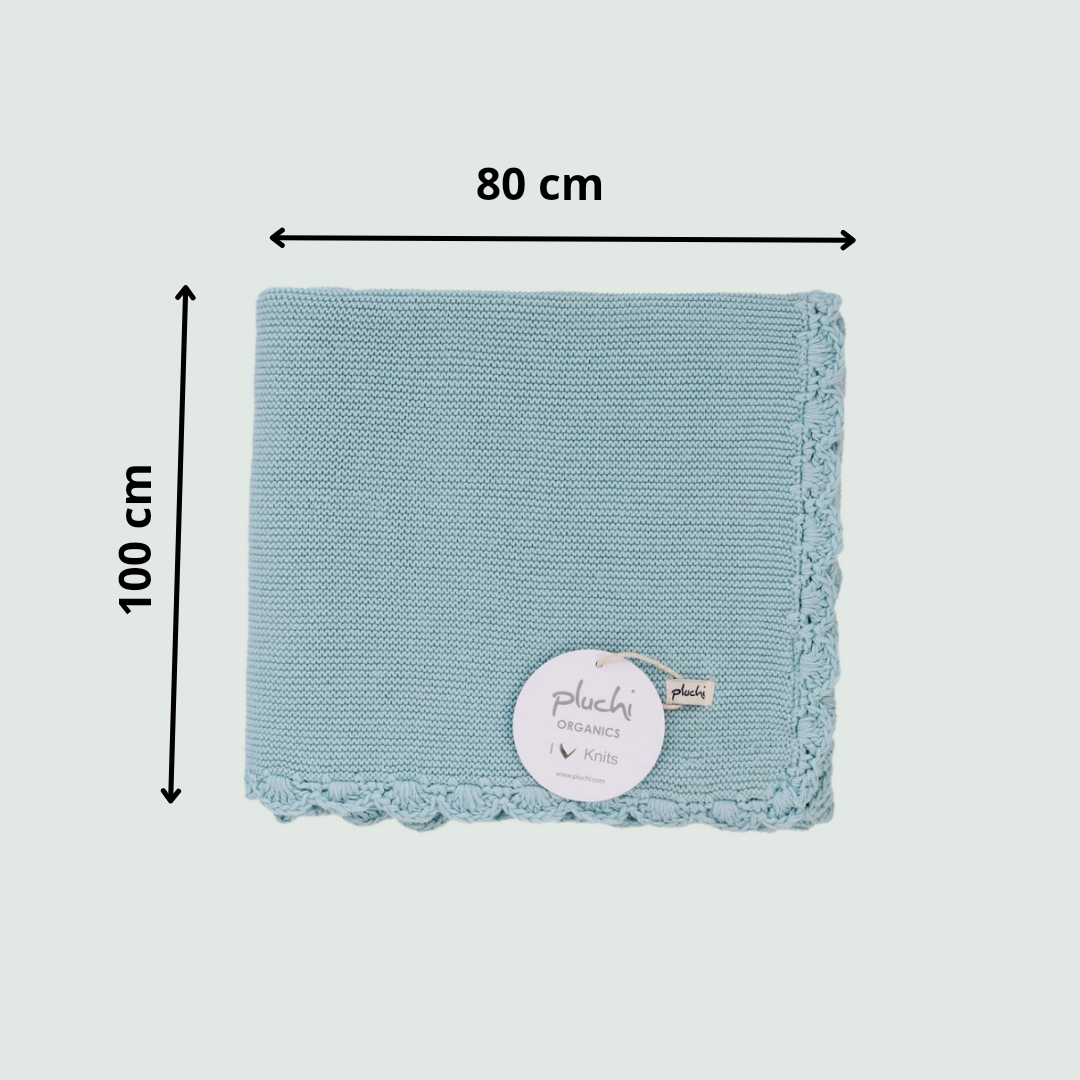 - Baby blanket knitted from 100% organic cotton in a soothing blue color.